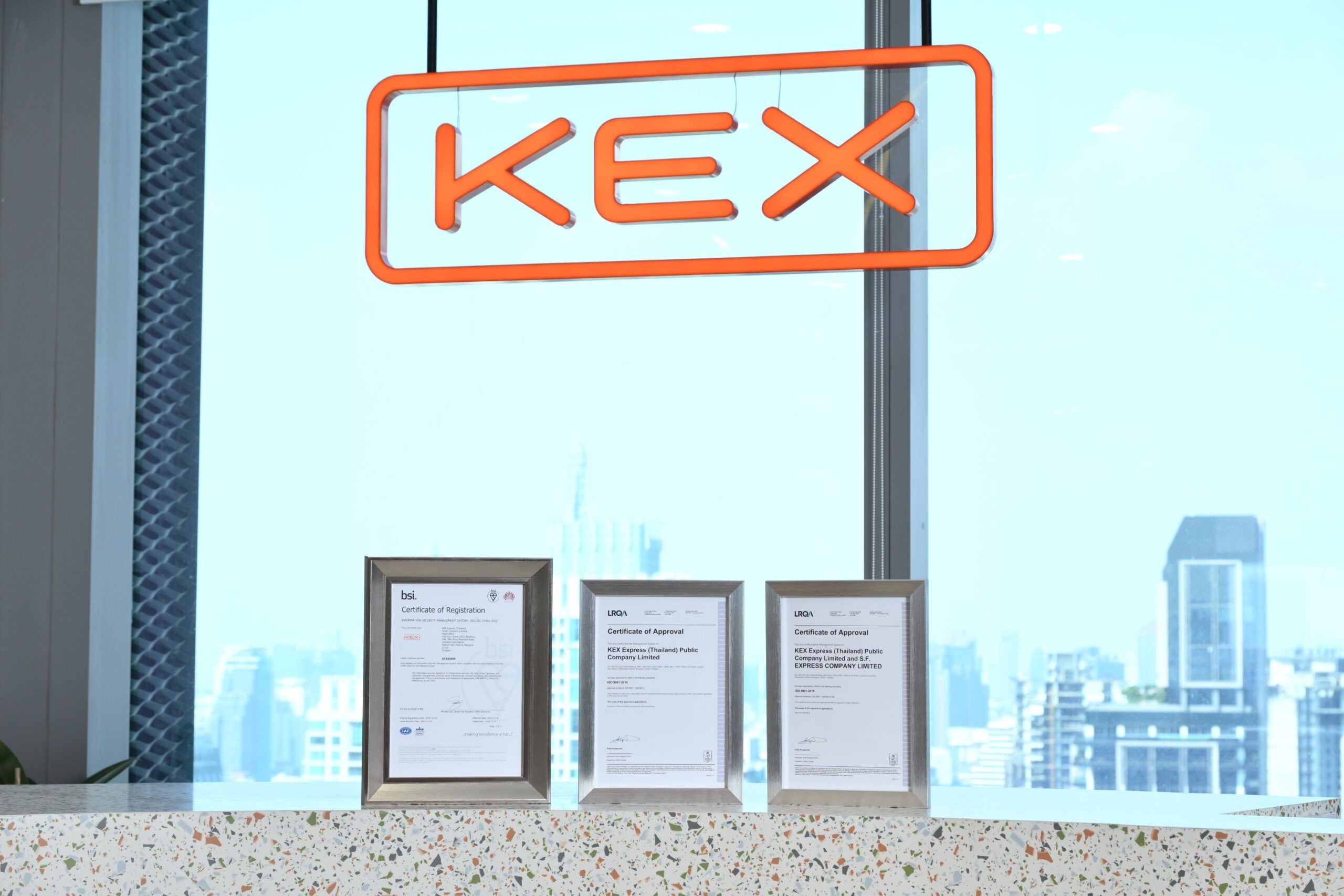 บริษัท เคอีเอ็กซ์ เอ็กซ์เพรส (ประเทศไทย) จำกัด (มหาชน) หรือ “KEX” ผู้นำด้านการจัดส่งพัสดุด่วนทั่วไทยและ SF Express ผู้ให้บริการด้านโลจิสติกส์ครบวงจรชั้นนำในประเทศจีน และเป็นบริษัทขนส่งด่วนที่ใหญ่เป็นอันดับสี่ของโลก* ประกาศความสำเร็จครั้งสำคัญในการยกระดับมาตรฐานการให้บริการ ด้วยการได้รับการรับรองระบบคุณภาพ ISO ตามมาตรฐานสากล โดยเฉพาะ KEX ที่ก้าวขึ้นเป็นบริษัทเดียวในอุตสาหกรรมโลจิสติกส์ไทยที่ครอง ISO ครบทั้งด้านระบบบริหารคุณภาพและความมั่นคงปลอดภัยสารสนเทศ ตอกย้ำความเป็นผู้นำ Logistics Tech Company ที่แท้จริง